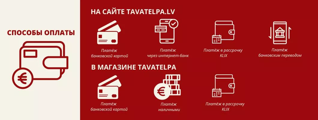 | Платеж банковской картой | Используйте оплату кредитной картой онлайн через банковский модуль или при получении товара в магазине TAVATELPA по адресу: Рига, Дамбья улица 3а. |